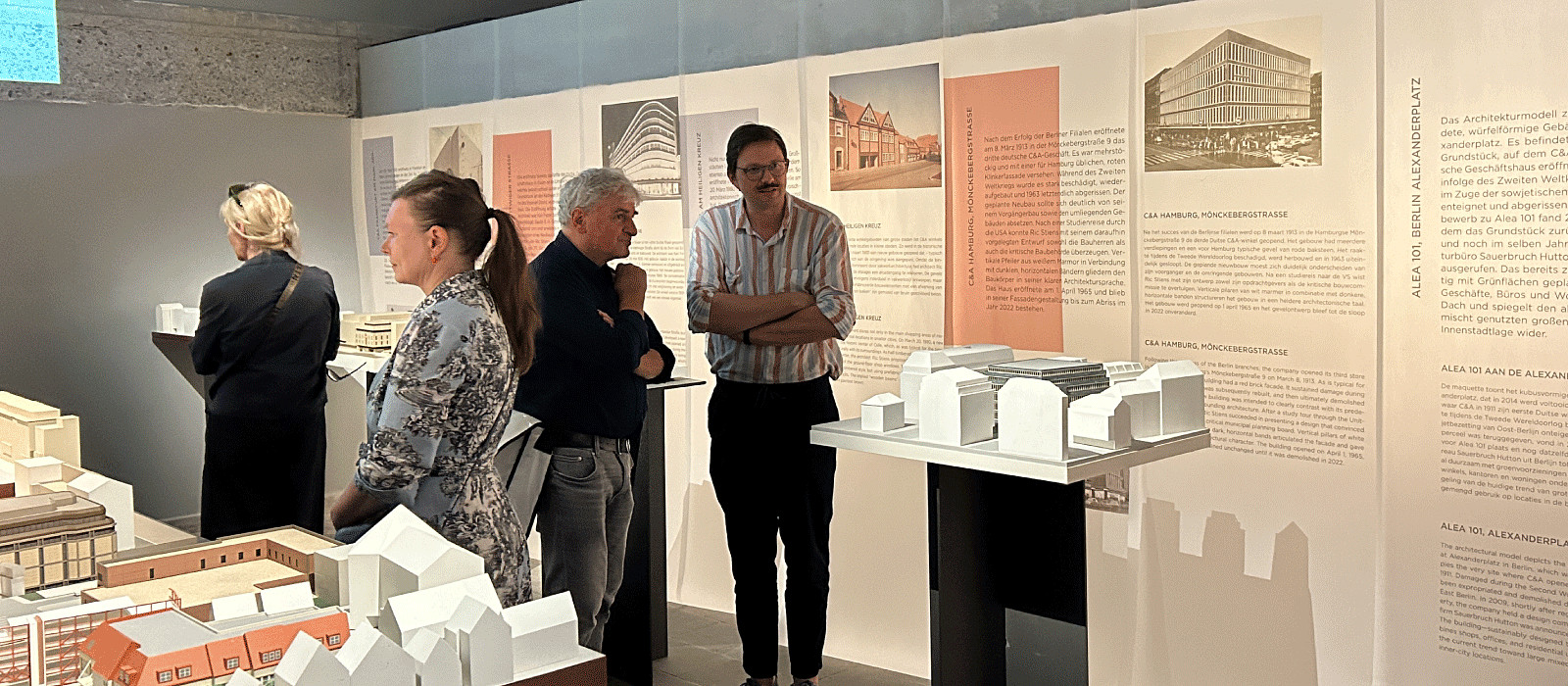 Historical photographs of the first C&A stores, built before the Second World War, set an atmospheric tone for the exhibition. Opposite these were models of the mixed-use complex Alea 101, designed by Sauerbruch Hutton in 2009 and now located on the site of the original C&A store in Königstraße in Berlin. The exhibition spanned a precisely composed arc from the beginnings to the present.