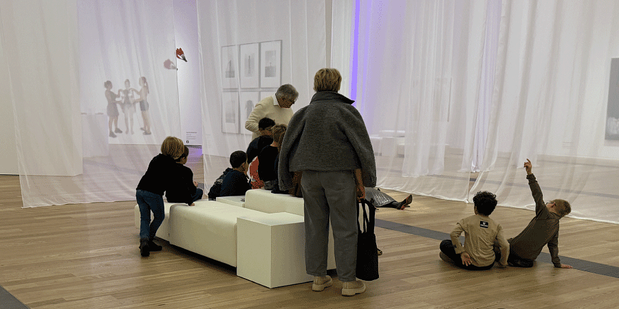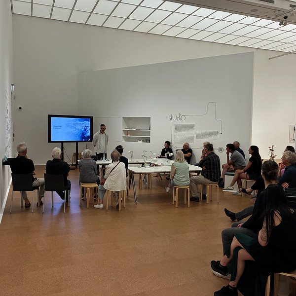 In the middle of the exhibition and within sight of the works, the studio, an open-plan but also partitioned room within the room, invited visitors to reflect on the exhibited works together with other visitors, exchange ideas, and discover new perspectives. An open space that invites communication and is therefore a place where art can be reflected upon, experienced, and discussed; in workshops, group tours, and also individually. Visitors made their thoughts visible, shared them, and learned from each other. Impressions and thoughts could be noted on the question cards provided and left on the wall in the studio. This created a lively dialogue in the exhibitions ROOTED AND BRANCHED and MAGICAL WOMEN, and once again it became clear that art is not only an object, but also an occasion for encounter, reflection, and shared thinking.