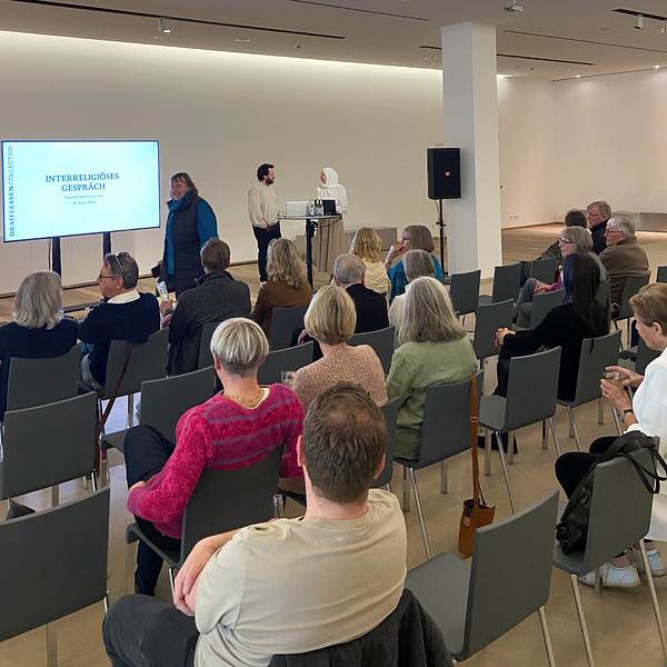 April 3, 2025: Interfaith dialogue with Du'A Zeitun as part of the exhibition IN THE BEGINNING WAS THE WORD. Talking with each other instead of about each other—this was the premise of the interfaith dialogue between Du'A Zeitun and Stefan Spitzer, in which a Muslim woman and a Christian man exchanged views on their faiths and sought out similarities and differences. An evening of communication that provided space for questions and thus helped to dispel misconceptions.